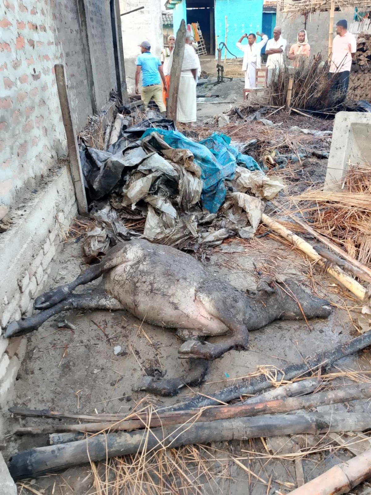 प्रहरीका अनुसार गोठभित्र रहेको एक भैंसीको टाउको र पेट जलेर करिब २५ प्रतिशत क्षति पुगेको छ । त्यस्तै दुई पाडीमध्ये एकको ९० प्रतिशत भाग जलेको अवस्थामा भेटिएको छ भने अर्काे पाडी जलेर घटनास्थलमै मृत्यु भएको छ।