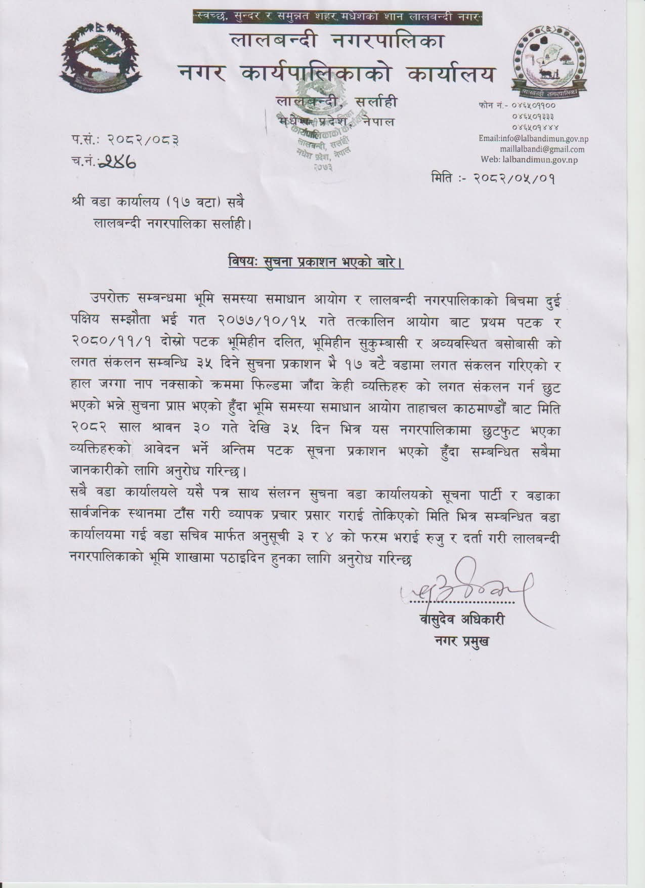 नगर प्रमुख वासुदेव अधिकारीद्वारा हस्ताक्षरित विज्ञप्तिअनुसार भूमि समस्या समाधान आयोग, ताहाचल, काठमाडौँको निर्देशनबमोजिम छुटेका व्यक्तिहरूका लागि २०८२ साल श्रावण ३० गतेदेखि लागू हुने गरी ३५ दिने अन्तिम सूचना प्रकाशन गरिएको छ । यो अवधिभित्र छुटेका सबै सम्बन्धित व्यक्तिहरूले आवेदन फारम भर्न सक्नेछन् ।