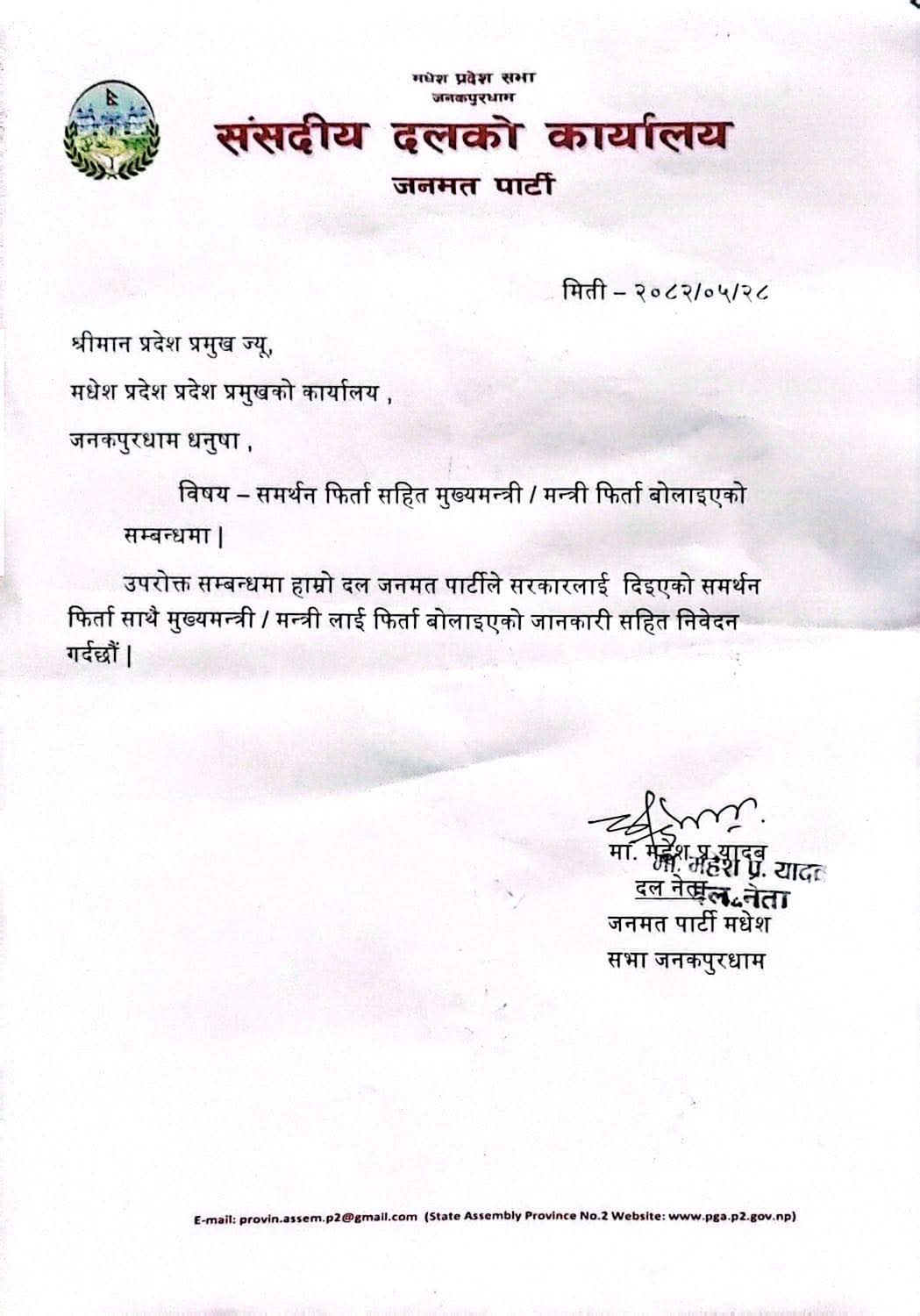 जनमत पार्टी संसदीय दलका नेता महेशप्रसाद यादवले आज मधेस प्रदेश प्रमुखलाई पत्र पठाउँदै समर्थन फिर्ता लिएको जानकारी गराएका हुन् । पत्रमा उल्लेख भएअनुसार जनमतले सरकारमा समर्थनसमेत उक्त पार्टीका मुख्यमन्त्री तथ मन्त्रीहरूलाइ फिर्ता बोलाएको छ ।